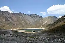 It is believed that Nevado de Toluca may once have been as tall as Popocatépetl, until an enormous eruption nearly 25,000 years ago blasted the top of the cone off and reduced its height by as much as 900 m (3,000 ft).[5] The same eruption generated thick lahars, or mudflows, which coated the sides of the mountains. An eruption approximately 500 years later deposited layers of pumice on the mountain's east and northeast slopes.[5]
