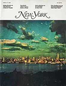 New York was created in 1963[10] as the Sunday-magazine supplement of the New York Herald Tribune newspaper. The Herald Tribune, then in financial difficulty, had recently been sold to John Hay Whitney, and was looking to revitalize its business with an increased focus on editorial excellence, which included a relaunch of the Sunday edition and its magazine. Edited first by Sheldon Zalaznick and then by Clay Felker, the relaunched magazine, called New York, showcased the work of many talented Tribune contributors, including Tom Wolfe, Barbara Goldsmith, Gail Sheehy, Dick Schaap, and Jimmy Breslin.[11] The Tribune went out of business in 1966, and New York was briefly revived as part of a combined paper, the World Journal Tribune, that lasted until May 1967. Shortly after the WJT closed, Felker and his partner, Milton Glaser, purchased the rights to the nameplate, backed by Wall Street bankers led by Armand G. Erpf (the magazine's first chairman, who Felker attributed as the financial architect of the magazine[12][13]) and C. Gerald Goldsmith (Barbara Goldsmith's husband at the time),[3][14][15] and reincarnated the magazine as a stand-alone glossy weekly. Joining them was managing editor Jack Nessel, Felker's number-two at the Herald Tribune. New York's first issue was dated April 8, 1968.[16] Several writers came from the magazine's earlier incarnation, including Breslin, Wolfe (who wrote "You and Your Big Mouth: How the Honks and Wonks Reveal the Phonetic Truth about Status" in the inaugural issue), and George Goodman, a financial writer who wrote under the pseudonym "Adam Smith." Glaser and his deputy Walter Bernard designed and laid out the magazine and hired many notable artists, including Jim McMullan, Robert Grossman, and David Levine, to produce covers and illustrations.