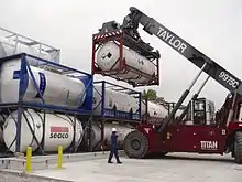 A Newport disposal site employee helped guide a stacker operator as he maneuvered an intermodal (ISO) container filled with hydrolysate.