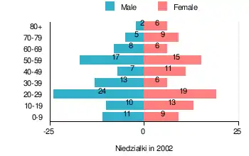 According to the 2002 Poland census, there were 193 people residing in Niedziałki village, of whom 50.8% were male and 49.2% were female. In the village, the population was spread out, with 19.2% under the age of 18, 40.4% from 18 to 44, 21.8% from 45 to 64, and 17.6% who were 65 years of age or older.[1]