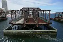 The Northern Avenue Bridge, also known as the Old Northern Avenue Bridge, is a bridge that spans Fort Point Channel Boston, Massachusetts. Built in 1908, it was closed to vehicle traffic in 1997 and operated as a pedestrian bridge until December 2014 when it was closed after inspectors found that thirteen floor beams were unsafe for pedestrians.[1] In an October 26, 2015 letter, the Coast Guard informed the City of Boston that the bridge was a 'hazard to navigation' due to the risk of it falling into the Fort Point Channel and requested removal of its most vulnerable portion.[2] The center span of the truss also carried a single track for the Union Freight Railroad, although it was designed for two tracks.[3] From 1912 to 1948, the bridge abutted a floating firehouse for Engine 44 of the Boston Fire Department.[4] Following its closure as a road bridge, various redevelopment schemes have been proposed for the bridge, as well as outright demolition of the span.[5]