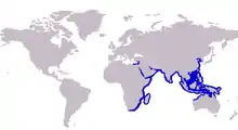 The northern whiting is the most geographically widespread of the Sillaginidae, but is still confined to the Indian and Western Pacific Oceans. Its easternmost range is from South Africa north along the west coast of Africa and into the Red sea and Persian Gulf.[5] It is common along the Indian and Asian coast, extending to Taiwan and has been recorded in Japan, however these likely are confused with S. japonica.[9] It is common throughout the Indonesian Archipelago, the Philippines and extends as far south as northern Australia.[10] The species has been declared an invasive species to the eastern Mediterranean, passing through the Suez Canal from the Red Sea since 1977 as part of the Lessepsian migration, becoming widespread.[11] In fact, the species of smelt-whiting which has invaded the Mediterranean is S. suezensis.[12]