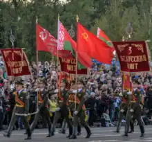 Belarusian Honor Guard carrying the national flags of Belarus and the Soviet Union, as well as the Soviet victory banner, in Minsk, 2019.