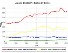 Prior to the 2011 Tōhoku earthquake and tsunami, Japan had generated 30% of its electrical power from nuclear reactors and planned to increase that share to 40%.[4] Nuclear power energy was a national strategic priority in Japan. As of March 2020, of the 54 nuclear reactors in Japan, there were 42 operable reactors but only 9 reactors in 5 power plants were actually operating.[5] A total of 24 reactors are scheduled for decommissioning or are in the process of being decommissioned.[6] Others are in the process of being reactivated, or are undergoing modifications aimed to improve resiliency against natural disasters; Japan's 2030 energy goals posit that at least 33 will be reactivated by a later date.[7]