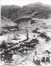 In the garrisoned area of the valley there were two villages; Jericho and Rujm El Bahr on the edge of the Dead Sea; other human habitations included the Bedouin shelters and several monasteries.[19] Arabs chose to evacuate Jericho during the summer months, leaving only the heterogeneous local tribes.[6] In the vicinity of the Dead Sea, the Taamara, a 7,000 strong semi-settled Arab tribe cultivated selected areas of the slopes of the Dead Sea about Wady Muallak and Wady Nur. They husbanded 3,000 sheep, 2,000 donkeys and a few large cattle or camels and travelled to the Madeba district to work as hired carriers.[20]