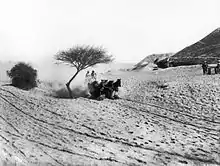 The British section guns were on the Pimple and the other 100 yards (91 m) to the left with the old road to the Ghoraniyeh crossing leading straight to our gun on the Pimple. At dawn a fairly large and close formation of Ottoman soldiers advanced straight at the Pimple gun which opened fire supported by light horse Hotchkiss light machine guns on the right. Although the action did not end for some hours the first 10 minutes decided it.[39]