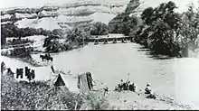Bivouac on the Jordan River, men washing clothes and exercising horses, with pontoon bridge and the Hills of Moab in the distance