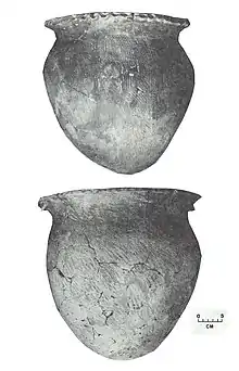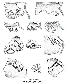 9,747 sherds were recovered in the 1947 excavations, with the pottery analysis based on 395 rim sherds and decorated body sherds.[9] In 1970–72, 3,746 sherds were recovered representing at least 64 vessels.[10]