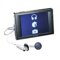 The MR:100 was a 5GB MP3 player. It had a bright red on deep blood red 1.25 x 1 inch display which was 160 pixels wide and 128 pixels high. It also had a Synaptic touch pad for the controls that glowed red where the sensitivity pads are. The entire front was covered in a single piece of glass, and when the m:robe was turned off or idling, the front turned all black. It had a metal back painted in Pearl White, although in Japan limited numbers were also available with a Pearl Pink or Lagoon Blue back. The MR-100 used the same PortalPlayer PP5020 CPU as the iPod mini, and used a very similar interface. The player was compatible with MP3 and WMA files. It included an AC adapter, a USB cable, a dock, a pair of earbuds, a headphone extension wire, a CD-ROM with the player's software, and documentation. Additional accessories included a red or black rubber sleeve and a wired remote that plugs into the MR:100.