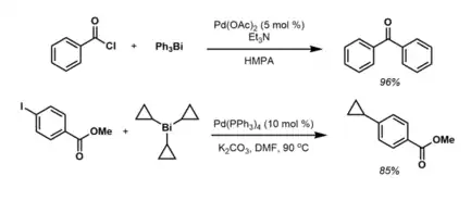 Triarylbismuth compounds have very limited use in organic synthesis.[11] They react with acylchlorides under Pd(0) catalysis to form a variety of phenyl ketones.[12] Tricyclopropylbismuth(III) reagents react with aryl halides and triflates under Pd(0) catalysis in a similar fashion to afford a variety of aryl and heteroaryl cyclopropanes.[13]