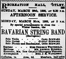 It was normal practice for bands such as Schwarz's to be resident all summer in one town, but to take extra bookings in nearby locations.[3] On 16 August 1904. Schwarz and his band provided the music for the annual dinner of the United Billposters' Association, at the Crown Hotel, Harrogate.[8] On 23 June 1906 at the Wells House Hotel and Winter Gardens, Ilkley, Schwarz and his band were one of several playing at the hotel's 50th anniversary celebrations.[9] In 1907 the band – described as the "Blue Bavarian Band" – performed "A brief, though artistically-rendered programme" at the Queen's Hall, Otley. They were on their way to Blackpool, where Schwarz's father used to perform.[10] On 30 March 1908, the Bavarian String Band performed at the Queen's Hall, Otley: the march from Tannhäuser, a Suppé overture, a Strauss waltz, The Gondoliers, Troop March by Lutz, and a fantasia from Lohengrin.[11] Monday 28 March 1910 was a day of "glorious weather", in which bands and other entertainments played across Harrogate, to attract visitors at the spa. Those on Prospect Hill in daytime, and at the Kursaal in the evening, were "regaled by Otto Schwarz's Bavarian Band".[12] On 28 July 1904 and 3 August 1912, Schwarz and his band provided the music at the annual sports day of Clifton College, Harrogate, on Harrogate Cricket Ground, in front of a "large and fashionable assemblage of spectators".[13][14]