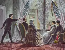 During the ensuing laughter, John Wilkes Booth, a famous actor and Confederate sympathizer who was not a member of the play's cast, entered Lincoln's box and fatally shot him in the back of the head. Familiar with the play, Booth had chosen that moment in the hope that the audience's laughter would mask the sound of his gunshot. Booth then leapt from Lincoln's box onto the stage and made his escape through the back of the theater to a horse he had left waiting in the alley. That night, the remainder of the play was suspended.[12] To this day, Our American Cousin has never been restaged at Ford's Theatre.[13]