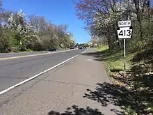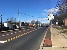 In 1946, the northern terminus of PA 413 was moved from Sellersville to the US 611 intersection in Pipersville. The former route between Sellersville and Pipersville became an extended PA 152 between Sellersville and Perkasie, unnumbered South Perkasie Road and Blooming Glen Road between Perkasie and Blooming Glen, and a rerouted PA 113 between Kulps Corner and US 611. In addition, the southern terminus was extended from Buckingham to US 13 in Bristol. The route replaced the entirety of PA 101 between Bristol and Penndel and part of PA 113 between Penndel and Buckingham.[10] By 1950, PA 413 was realigned to bypass Bath Road and Durham Road on its current alignment between Bristol and Penndel. In addition, the route was extended south from US 13 to the Burlington–Bristol Bridge, replacing PA 713.[11] In 1977, PA 413 was rerouted to bypass Newtown to the west on the Newtown Bypass.[12] The former alignment of PA 413 in Newtown followed State Street, Washington Street, Sycamore Street, and Durham Road.[13] In 1991, PA 332 and PA 532 were also rerouted to bypass Newtown following an extension of the bypass.[13][14] Also, the northern terminus of PA 413 at PA 611 was moved to its current location at Deep Run Road instead of where Durham Road intersected PA 611.[13]