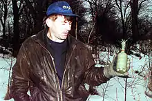 PROM-1 in the hands of a deminer. Note that the safety clip is in place, to prevent detonation.