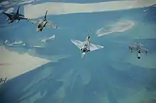 Emirati F-16's, an Emirati Mirage 2000, and a Pakistani F-7, left to right, fly in formation during a multinational exercise, Dec. 9, 2009.