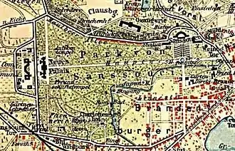 Sanssouci Park is a large park surrounding Sanssouci Palace in Potsdam, Germany, built under Frederick the Great in the mid-18th centurys. Following the terracing of the vineyard and the completion of the palace, the surroundings were included in the structure. A Baroque flower garden with lawns, flower beds, hedges and trees was created. In the hedge quarter 3,000 fruit trees were planted. The greenhouses of the numerous nurseries contained oranges, melons, peaches and bananas. The goddesses Flora and Pomona, who decorate the entrance obelisk at the eastern park exit, were placed there to highlight the connection of a flower, fruit and vegetable garden. Along with the Sanssouci Palace and other nearby palaces and parks, Sanssouci Park was inscribed on the UNESCO World Heritage List in 1990 for its unique architectural unity and testimony to 18th and 19th century landscaping in Europe.[1]