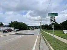 In the 1950s, the northern terminus of PA 24 was cut back to an interchange with I-83/US 111 southwest of New Market.[8] In addition, US 30/PA 24/PA 74 was moved onto the one-way pair of Market Street eastbound and Philadelphia Street westbound in York while US 111 Alt. was designated concurrent with PA 24 on George Street between US 30/PA 74 in downtown York and I-83/US 111 in North York, replacing US 111 which was realigned to follow I-83. US 111 Alt./PA 24 was routed onto the one-way pair of Duke Street northbound and George Street southbound south of North Street.[9] In 1961, PA 24 was realigned at Red Lion to head north to US 30 (now PA 462) east of York, where PA 250 continued north before turning west onto a northern bypass of York (now US 30). The former alignment of PA 24 north of Red Lion became solely PA 74 between Red Lion and York, I-83 Bus. (which replaced US 111 Alt.) between York and I-83 in North York, PA 181 between PA 250 (now US 30) in North York and York Haven, PA 382 between York Haven and PA 114 near Bunches, and an eastern extension of PA 114 between Bunches and New Market. This change was made as part of the construction of I-83 in order to provide a numbered route at each interchange.[10] In the 1970s, PA 24 was extended north to the eastern terminus of PA 921 in Mount Wolf, replacing the section of PA 250 between present-day PA 462 and US 30. In addition, the route was widened to a divided highway in the vicinity of the PA 462 intersection.[11]