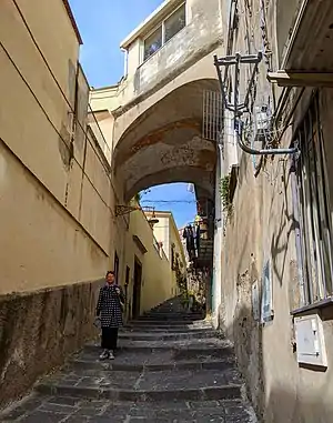 As one of Naples' roughly more than 200 neighborhood stairs, inclined walks and ramps,[3] the Petraio is accessible only on foot, and is noted for its range of architecture from Neapolitan Liberty villas to bassi, small one and two room dwellings directly accessed off the Petraio itself as well as its picturesque character and broad views of the city, the Gulf of Naples,[4] Sorrento and the isle of Capri.