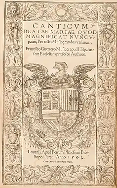 6. KU Leuven Libraries Special Collections, RC81 (1563). "Canticvm beatæ Mariæ qvod magnificat nvncvpatur, per octo musice modos variatum., Francisco Guerrero musices apud Hispalensem ecclesiam præfecto authore".{{cite web}}: CS1 maint: numeric names: authors list (link)