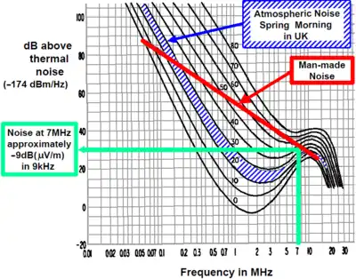 - ↑ The upper HF and higher frequencies are naturally noise-free, but the quiet can be spoiled by nearby noise sources; for example: lightning storms a few tens of miles away, or badly-made rechargers for hand-carried electronics in one's own and neighboring houses.
