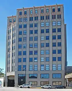 The Produce Terminal Cold Storage Company Building is a historic refrigerated warehouse at 1550 South Blue Island Avenue in the Near West Side neighborhood of Chicago, Illinois. Built in 1928–29, the warehouse was the largest cold storage facility in Chicago when it opened. As Chicago was a major shipping and transportation hub, refrigerated storage played a key role in preserving perishable goods so they could be sold year-round. Architects H. Peter Henschien, a renowned designer of refrigerated facilities, and Robert J. McLaren designed the Art Deco building. The top two stories of the eleven-story building feature extensive terra cotta and tile ornamentation, including chevrons, Egyptian-inspired colonettes, and a dentillated cornice with cymatium molding. In addition to its extensive refrigerated space, the interior plan also included processing and office space, improving efficiency and lowering costs for the building's tenants.[2]