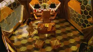 CGI is prominent in the series, with much use of blue screen technology[22] (the shop window, similar set pieces and outdoor scenery outside often cast a blue halo tinge) and 3D set-extensions (streets, grass and landscape, the pie shop façade). The use of matte painting backdrops are used to complete the look.[23]
