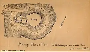 Archeological excavations reveal that between the 9th and 12th centuries a Latgalian wooden fortress was situated in the place where the castle ruins now stand. It is unknown when the Latgalian fortress was destroyed; however, in 1285,[1] the master of the Livonian Order Vilhelms Šurborgs built a stone fortress on the Rositten stone hill. The fortress consisted of a two-story brick and stone castle with a three-storey towers and thick brick walls, functioning as the administrative seat of Rezekne.