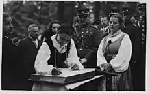 In 1928, for the 10th anniversary of the Act of Independence of Lithuania, Martynas Jankus decided to create a guestbook for those who visited Rambynas. Signing in the book became an integral part of the tradition during the interwar celebrations of Saint Jonas' Festival.[18] The book, known as the Eternal Book of Rambynas, is one of the largest in Lithuania. It measures 61.5 by 44 centimetres (24.2 in × 17.3 in) and is 10 centimetres (3.9 in) thick. It weighs 18.5 kilograms (41 lb) and is accompanied by a wooden case that weights another 10 kilograms (22 lb).[18] The covers are wood upholstered with leather and metal corners and close with two buckles. The second page is a portrait of Grand Duke Vytautas by Adomas Varnas.[18] The first comment was left by Vydūnas.[19] The visitors left notes and comments in Lithuanian, Latvian, Estonian, Russian, German, Finnish, Swedish, Norwegian, Japanese, Hindi.[18] The Japanese comments were left by Yotaro Sugimura, Assistant Secretary-General of the League of Nations.[13]