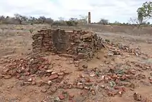 For 19th century diasporic Chinese communities such as Ravenswood's, the establishment of specific cultural settlement areas, or "Chinatowns", that "provided a range of sacred and secular services, including temples, stores and accommodation", was an important aspect of community building.[46][47] Deighton Street, west of Macrossan Street, was the centre of Chinese life in Ravenswood. There were two eating houses close to Macrossan Street's bridge across Elphinstone Creek, in the 1870s;[48] and market gardens were located between Deighton Street and Elphinstone Creek, as well as north of Elphinstone Creek, interspersed amongst several crushing machine operations.[49] There was also a temple south of Deighton Street. Temples were not just places of religious worship; rather, they were an integral part of a Chinese village. "They were places to meet, to check one's horoscope before embarking on a new venture and places where ancestors were venerated."[50] As well as being a place where the community could worship at any time, major gatherings were held at temples on festival days, with feasts and processions. The Ravenswood temple appears on an 1874 survey plan, making it the earliest known Chinese temple in Queensland.[51] Temples were later built at towns including: Cooktown (1877), The Palmer (c.1878), Port Douglas (c.1880s), Cairns (1886), Breakfast Creek in Brisbane (1886), Etheridge/Georgetown (1891), Croydon (1897), and Atherton (1903).[47][50][52][53] The nearby pig roasting oven is also a rare example of its type, and demonstrates the usual spatial arrangement of temple and oven, for community feasts.[47] Another example of a pig oven is found at Croydon,[50] while the site of a pig oven is visible in Atherton.[53] It has been suggested that Chinese pig ovens may be a phenomenon only found in Chinese migrant communities in Australia and New Zealand and may reflect practices from specific localities in China.[1][54]