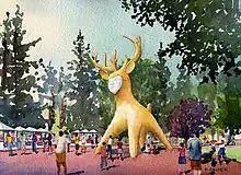 Seyed Alavi's Rebirth was a proposed sculpture considered for installation at the MAX Orange Line's Southeast Park Avenue MAX Station in Oak Grove, an unincorporated area neighboring Milwaukie. The design of the unfinished creative work called for a 30-foot (9.1 m) yellow-painted deer with a child's face and was intended to represent "the interaction between the nearby riparian forest and the people living in Oak Grove".[2] In its concept proposal, the art installation is described as:
