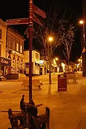 Key shops and other outlets within the town centre include a multi-screen cinema, a covered market way, an old butter market, various antique shops, a second hand book shop and two supermarkets, plus Greens Newsagents, and the local cash and carry Jims. Off the main street (Fore Street), there are two separate specialist shopping areas, Bond Street (to the south of the railway station) and Green Lane to the north.
