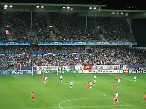 ![]() Top: Rosenborg BK's official logo Bottom: Rosenborg playing against Lyon at Lerkendal Stadion during the 2005–06 UEFA Champions League | |