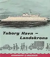 SL ferries (short for Swedish Skandinavisk Linjetrafik or Scandinavian Line Traffic) was a shipping line that operated with car ferries in the central part of Øresund, between Copenhagen, Port of Tuborg, Zealand, Denmark and Landskrona, Scania, Sweden. The shipping line was to sail this route between 1951 and 1980.[1] During the first ten years of operation, the SL ferries was a Danish owned shipping line, but in 1961 SL was bought by Stockholms Rederi AB Svea.[1] The new owners also owned the LB (car ferries) which since 1955 operated at the HH Ferry route between Helsingør (45 km north of Copenhagen) and Helsingborg (25 km north of Landskrona), the first challenger of the de facto monopoly at that route which DSB had enjoyed since 1882.