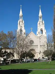 Saints Peter and Paul Church (Italian: Ss. Pietro e Paolo, Chinese: 官話圣伯多禄圣保禄教堂; pinyin: Guānhuà Shèngbǎoluó Shèngbǐde Jiàotáng) is a Catholic church in San Francisco's North Beach neighborhood. Located at 666 Filbert Street, it is directly across from Washington Square and is administered by the Salesians of Don Bosco. It is known as "la cattedrale italiana dell'Ovest", or the Italian Cathedral of the West (the use of the word "Cathedral" is merely colloquial, not an official designation), and has served as the home church and cultural center for San Francisco's Italian-American community since its consecration. It offers English, Italian, and Cantonese-language services.