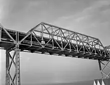 East of Yerba Buena Island, the bay to Oakland was spanned by a 10,176-foot (3.102 km) combination of double cantilever, five long-span through-trusses, and a truss causeway, forming the longest bridge of its kind at the time.[22] The cantilever section was longest in the nation and third-longest anywhere.[39]