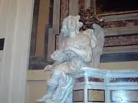 The church was founded in 1434, but little of the medieval structure remains. Numerous reconstructions, most recently 1992, have altered the plan. The original entrance was on the opposite side; the canvas of Solimena was on the counterfacade. With the alterations in city streets, the church was altered, and left with a simple facade. In the interior, on the right is visible a spherical shrapnel walled into the external facade during the bombardment of World War II. The polychrome altar has been stripped of some of its sculptural and painted decoration, it retains two 16th century bas-reliefs representing Motherhood. The main altar hosts a large canvas by Francesco Solimena depicting the Glory of Mary with Saints (circa 1705).