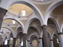The Franciscan friary is dedicated to the Archangel Gabriel. The complex is surrounded by a wall with pointed merlons which separates it from the main plaza of the city. There are three entrances to the atrium, but the main one is to the west, in front of the main church. The atrium is very large and most of it is in front of the two chapels. A second entrance in the atrium wall leads to this area, which may have been used for evangelization purposes and masses for the indigenous during the very early colonial period. In three corners of the atrium, there are chapels, called "capillas posas", with pinnacle roofs, simple arches which are closed off by railing.[17] The atrium cross was sculpted in 1668. It is identical to that in the atrium of the Nuestra Señora de los Remedios sanctuary.[17] The main church is one of the oldest in Mexico, which the first stone laid in 1549 by Martin de Hojacastro, who would be the third bishop of Puebla.[17] The facade of the main church is smooth and its corners are reinforced with diagonal buttresses. The towers have arched windows, columns and a small dome topped by iron cross. The interior has a Latin cross layout, covered with vaults and a cupola. The altarpieces are made of wood and plaster and decorated in gold leaf. The main one is dedicated to the Virgin of the Remedies. The main portal is sculpted in sandstone in Renaissance style. The main doors are of wood and contain metal studs with different designs. The north portal has richer ornamentation. The interior is covered by vaults with Gothic nerves and arched window openings. It conserves a number of oil paintings from the 17th and 18th centuries. The main altar of San Gabriel is Neoclassical, dating from 1897.[18]