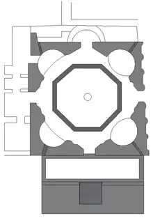 At the time of its construction, the building's interior consisted of a cylinder inscribed in a cube and covered by a hemisphere, all built entirely of opus mixtum in the likeness -reduced in scale- of Rome's Pantheon.[49]