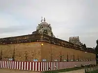The temple has a vast Prakarams (courtyards) with high walls of enclosure. There are two sets of seven-tiered gopurams on the outer walls of the enclosure. The porch on the entrance from the second to the first prakara date back to 10th to 11th century.[10] The original shrine during the period of the Nayanmars included the shrine of Bhrammapureeswarar, on the southern bund of the temple tank; the Tonniappar shrine on a mound west of the central shrine, and the Sattanathar shrine in the second floor reached from the southern praharam(outer courtyard) of the Toniappar shrine by a flight of steps. The enlargement of the original temple happened during the period of Kulothunga Chola I, Vikrama Chola, Kulothunga Chola II and Kulothunga Chola III (as in Chidambaram - 11th through the 13th centuries).[11] The temple is a holy site for Hinduism and thousands of devotees come to pay homage to the deities.[12] The image of Parvathi in the form of Sthira Sundari is located in the basement in a separate shrine.[13]