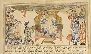 In 1040, at the Battle of Dandanaqan, Seljuks decisively defeated Mas'ud I of Ghazni, forcing him to abandon most of his western territories.[31] Afterwards, Turkmens employed Khorasanians and set up a Persian bureaucracy to administer their new polity with Tughril as its nominal overlord.[32] By 1046, Abbasid caliph al-Qa'im had sent Tughril a diploma recognizing Seljuk rule over Khurasan.[33] In 1048–1049, the Seljuk Turks, commanded by Ibrahim Yinal, uterine brother of Tughril, made their first incursion into the Byzantine frontier region of Iberia and clashed with a combined Byzantine-Georgian army of 50,000 at the Battle of Kapetrou on 10 September 1048. The devastation left behind by the Seljuk raid was so fearful that the Byzantine magnate Eustathios Boilas described, in 1051–1052, those lands as "foul and unmanageable... inhabited by snakes, scorpions, and wild beasts." The Arab chronicler Ibn al-Athir reports that Ibrahim brought back 100,000 captives and a vast booty loaded on the backs of ten thousand camels.[34] In 1055, Tughril entered Baghdad and removed the influence of the Buyid dynasty, under a commission from the Abbasid caliph.[33]