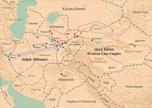 In 1141, Ahmad marched to eliminate the threat posed by Kara Khitans and faced them in the vicinity of Samarkand at the Battle of Qatwan. He suffered his first defeat in his long career, and as a result lost all Seljuk territory east of the Syr Darya.[43][44]