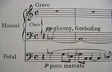 The opening theme of the piece provides the basis of all the rest of the thematic material. This music is an interpretation of the text 'Herr, Gott, des die Rache ist, erscheine'; a head-motif is followed by a descending chromatic scale. Ascending chords on the manual follow, a musical invocation of God. The development section of the first movement, from the allegro con fuoco, depicts the second group of verses, leading into a recapitulation in organo pleno.