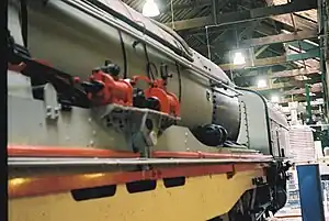 The boiler was of exceptional size with an inside diameter of 7 feet (2,134 millimetres), double the track gauge. It used a top feed and contained 263 small tubes of 2 inches (51 millimetres) outside diameter and 50 large tubes of 5+12 inches (140 millimetres) outside diameter, while the superheater elements were of 1+12 inches (38 millimetres) diameter. The round-topped firebox with its 75 square feet (7.0 square metres) grate area was fired by a duplex mechanical stoker, the only class on the SAR which had this feature. The firebox contained two Nicholson thermic syphons and two arch tubes. Clyde Superior soot blowers were fitted on each side of the firebox. Beyer, Peacock estimated the Class GL locomotive's economical coal consumption rate at 3+12 long tons (3.6 tonnes) per hour.[1][2][6]