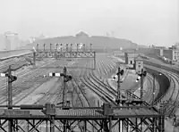 In the original configuration, two tracks came off each approach to join into a four-track line and then run under the main platforms in a two-track loop. These tracks were never put into service, and later became a parking lot and bowling alley for employees.[10]