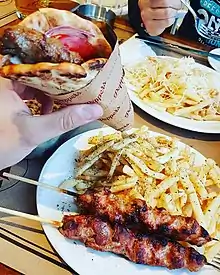 Souvlaki (Greek: σουβλάκι, souvláki, [suˈvlaci]; plural: σουβλάκια, souvlákia) is a Greek fast food consisting of small pieces of meat and sometimes vegetables grilled on a skewer. It is usually eaten straight off the skewer while still hot. It can be served with or inside a rolled pita, typically with lemon, sauces, vegetables such as sliced tomato and onion, and fried potatoes as a side. The meat usually used in Greece and Cyprus is pork, although chicken, beef, and lamb is used in Turkish kitchens.