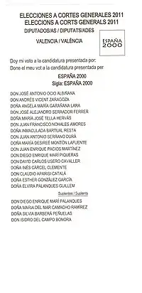 In the 2011 municipal elections, España 2000 won five council seats.[34] A councillor in Onda with 649 votes (5.05%), one in Dos Aguas with 66 votes (12.43%), two in Silla (Valencia) with 997 votes (9.56%) and one in Alcalá de Henares with 4,541 votes (5.18%).