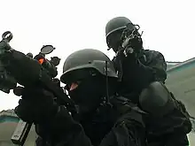 The tactics and organization of the UTK are primarily influenced by the German GSG-9, but with a difference; UTK operatives operate mostly in plain clothes and also perform undercover missions. With approximately 300 members, the UTK is deployed in cases of hostage taking, kidnapping, terrorism and extortion. The group may also be used to secure locations, neutralize targets, track down fugitives, escorting and protecting leaders and VIPs, and occasionally conduct sniper operations.[11][12] UTK members are trained to operate urban operations,[13] airborne operations, and underwater operations.
