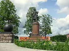 The bronze statue is mounted on a massive pedestal of red Ukrainian granite, and is 9.5 m (31 ft) high, the statue itself being 4.6 m (15 ft).[1]