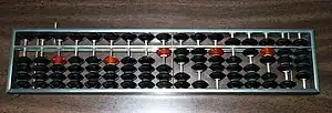The suanpan (simplified Chinese: 算盘; traditional Chinese: 算盤; pinyin: suànpán), also spelled suan pan or souanpan[1][2]) is an abacus of Chinese origin first described in a 190 CE book of the Eastern Han Dynasty, namely Supplementary Notes on the Art of Figures written by Xu Yue. However, the exact design of this suanpan is not known.[3] Usually, a suanpan is about 20 cm (8 in) tall and it comes in various widths depending on the application. It usually has more than seven rods. There are two beads on each rod in the upper deck and five beads on each rod in the bottom deck. The beads are usually rounded and made of a hardwood. The beads are counted by moving them up or down towards the beam. The suanpan can be reset to the starting position instantly by a quick jerk around the horizontal axis to spin all the beads away from the horizontal beam at the center.