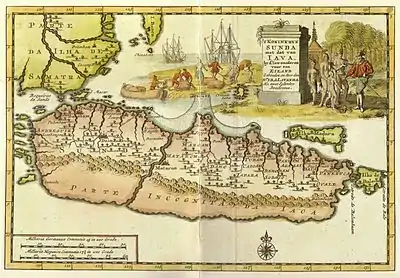 An early-18th century map of Java. Note that only major trading ports on the northern coast were known to the Europeans. From west to east: * Bantam (Banten) * Xacatara (Jayakarta) * Cherebum (Cirebon) * Taggal (Tegal) * Damo (Demak) * Iapara (Jepara) * Tubam (Tuban) * Sodaio (Sedayu, now near Gresik) * Surubaya (Surabaya).